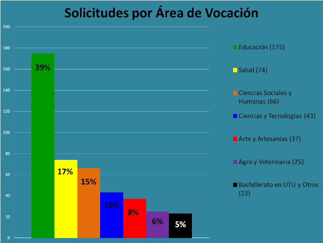En cuanto a las distintas áreas de vocación, el área vinculada a la Educación, al igual que el año pasado, fue la más numerosa al solicitar la beca, seguida por el área de la Salud y el área de las Ciencias Sociales.